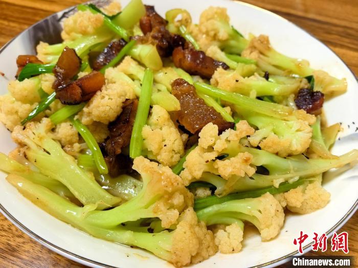 腊肉香芹炒菜花,在广东台山被赋予花开富贵的好寓意。李晓春 摄