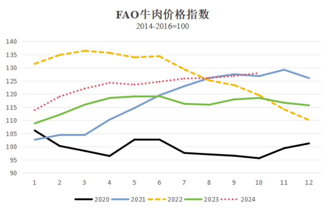 据联合国粮农组织(FAO)数据,2023年2月开始国际牛肉价格指数进入上升通道,2024年延续上升态势。截至2024年10月,牛肉价格指数较1月份上升了12.4%,已经达到了2020年以来同期最高水平。分国别来看,1—10月份,澳大利亚出口到美国的牛肉平均离岸价为6.23美元/公斤,同比上涨12.6%;美国出口牛肉平均离岸价为9.41美元/公斤,同比上涨7.6%,均为近年来最高。