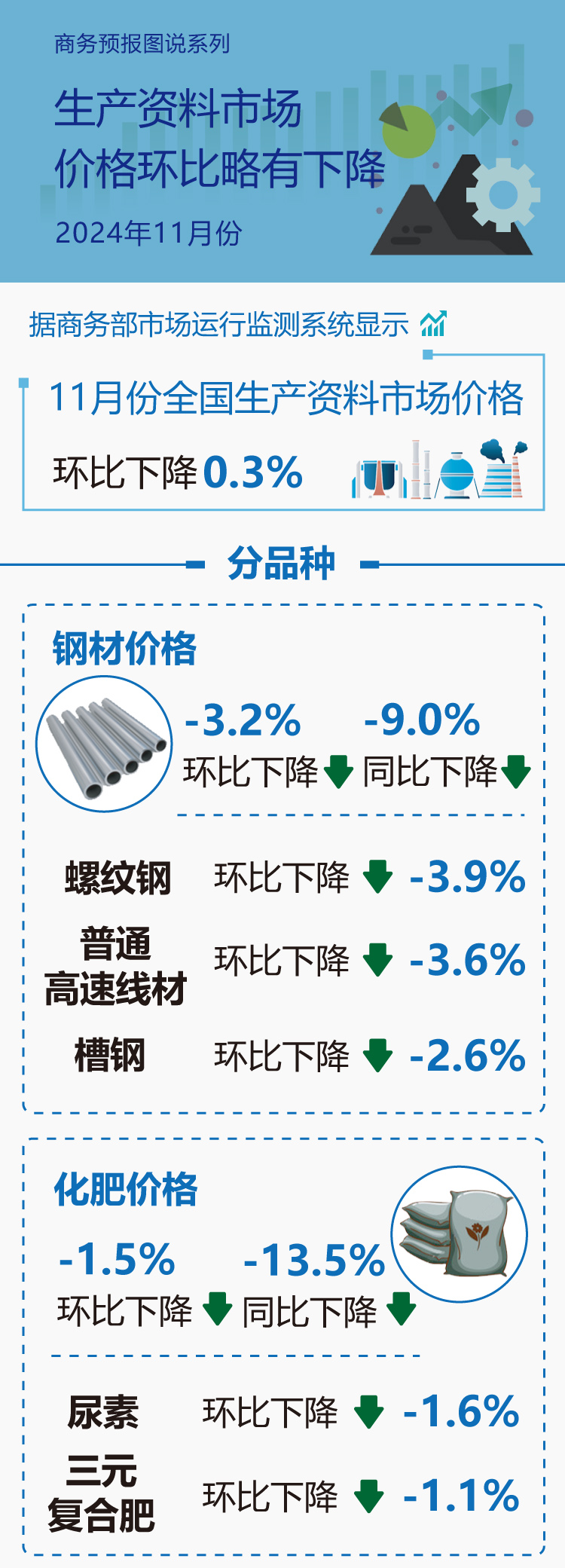 据商务部市场运行监测系统显示,11月份,全国生产资料市场价格环比下降0.3%。