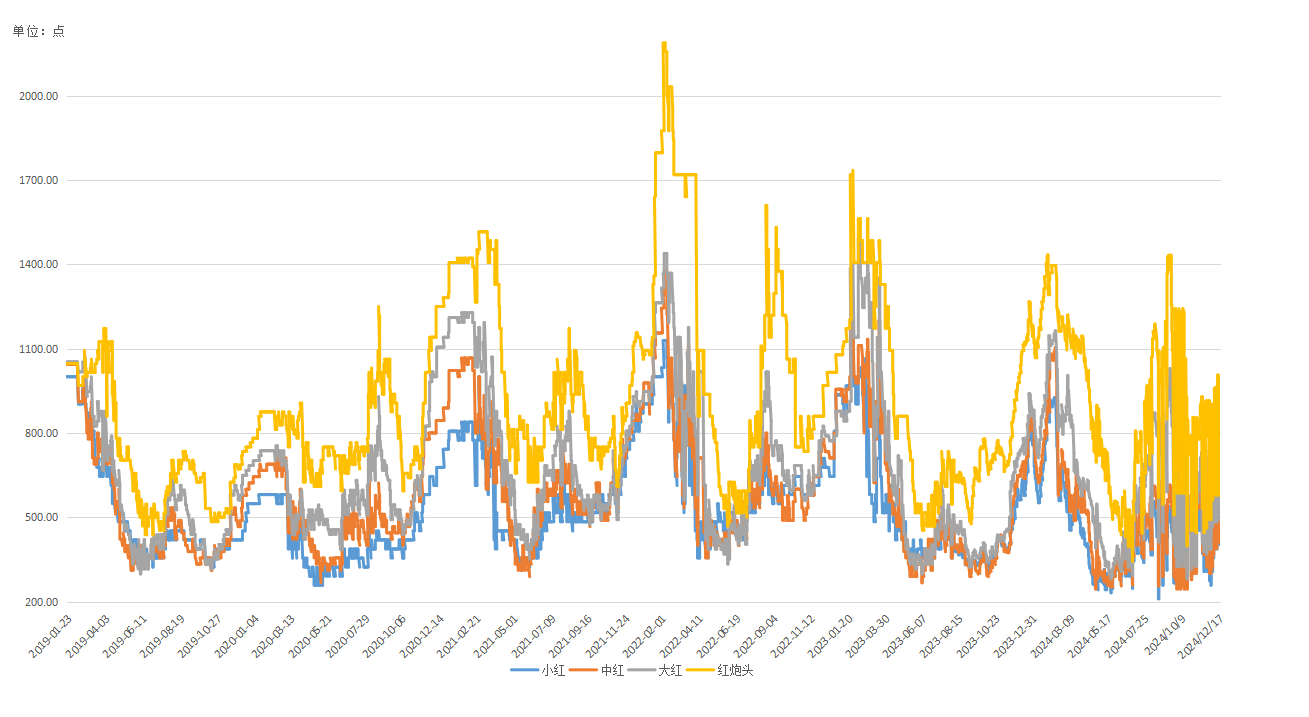 截至12月23日,红虾均价报39.35元/斤,环比上涨1.68%。其中,小红均价报19.90元/斤,环比上涨4.74%;中红均价报31.50元/斤,环比上涨2.94%;大红均价报43.90元/斤,环比上涨0.69%;红炮头均价报62.10元/斤,环比上涨0.81%。