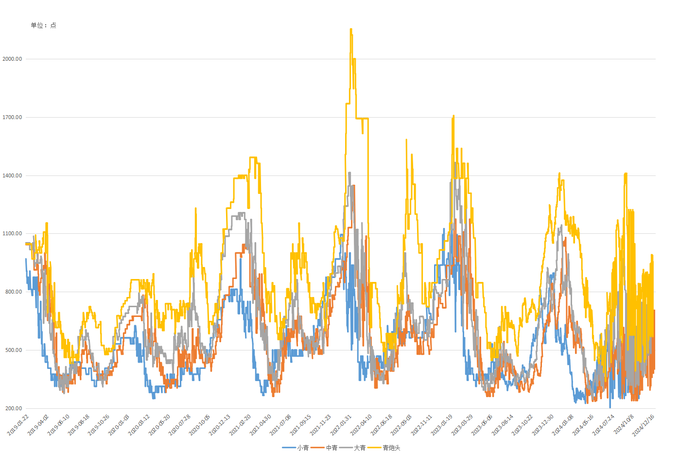 截至12月23日,青虾均价报39.35元/斤,环比上涨1.68%。其中,小青均价报19.90元/斤,环比上涨4.74%;中青均价报31.50元/斤,环比上涨2.94%;大青均价报43.90元/斤,环比上涨0.69%;青炮头均价报62.10元/斤,环比上涨0.81%。