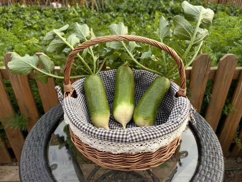 另一组“实力选手”是肉质翠绿来自天津卫的青萝卜,包括“天星2号、百翠3号、七星”等。说起天津种植青萝卜,可以追溯到元朝!距今已有六百多年的历史。如今的种业发展,让“沙窝萝卜”在一脉相承之下又有了新的开创和突破。“天星2号”通体绿如翡翠,表皮光滑细腻,皮薄汁多。“天星2号”还能做到不用贮藏,就达到又甜又脆的口感。更重要的是它在抗病和高产方面都表现优异,深受种植户的青睐。“百翠3号”,则是外观略显传统,地上部分翠绿,地下部分发白,中间有着漂亮的渐变,皮细光亮,肉质紧密。皮肉像小红萝卜一样可以轻易分离,咬下一口味道鲜甜,糖度好像还更胜一筹。