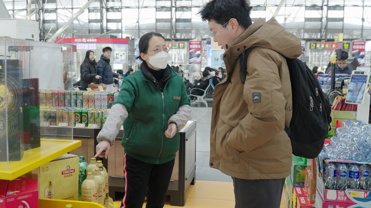 在琳琅满目的青岛特产年礼中,不少旅客都拎在手上的青岛啤酒精品原浆显得格外瞩目, “平时也捞不着多陪陪家人嘛,带点这个酒,因为它的保质期特别短,特地带回去让家人尝尝新鲜的味道”,从青岛返乡太原的刘先生说道。
