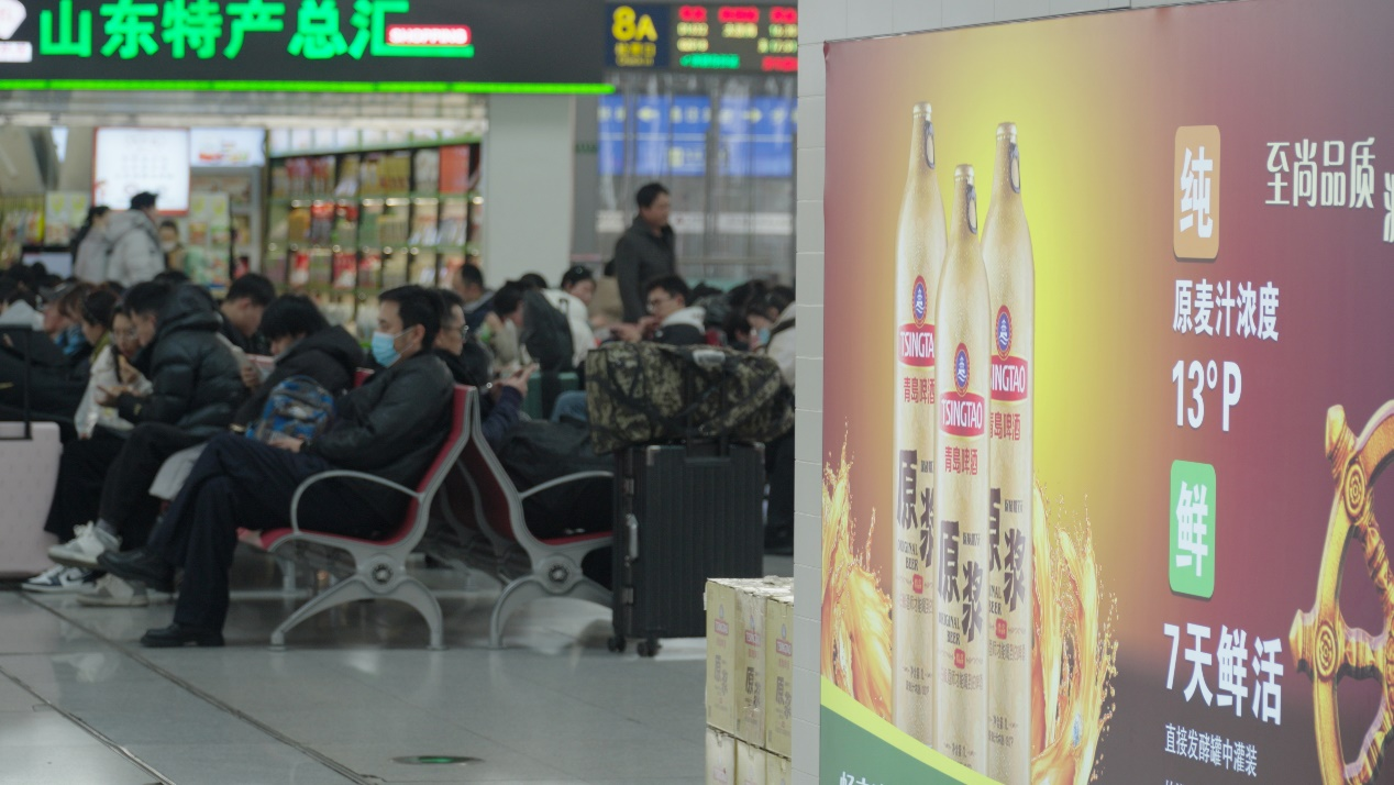 日前,在青岛北站的候车室中,啤酒生鲜、贝雕、茶叶等青岛特色产品琳琅满目。“啤酒是青岛的特色,许多旅客都会在高铁站买了啤酒当做年货、伴手礼带给家人朋友。”工作人员说道。得益于物流运输日益发达,中国人沉甸甸的新春“购物车”满载对美好生活的向往,彰显经济发展的蓬勃活力。