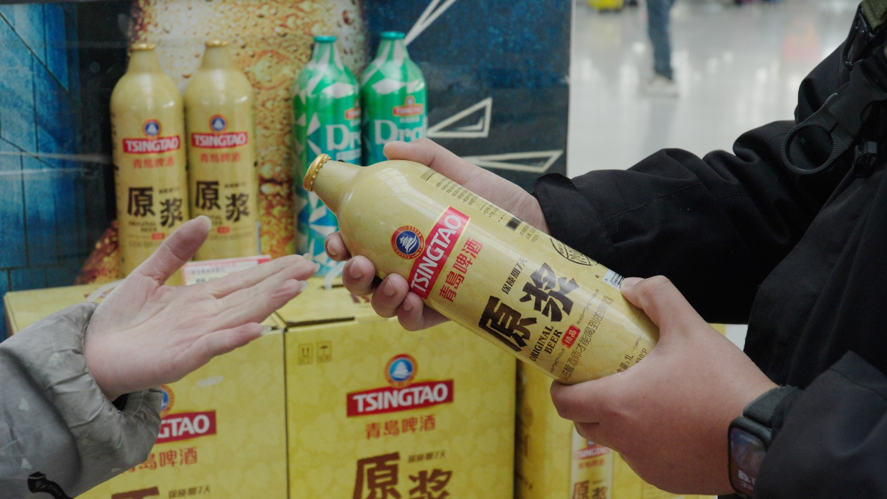 “最近这个原浆老火了,经常在网上刷到好评,我们自己也买来喝,口感确实是、新鲜,所以肯定要从青岛带箱回去嘛”,29岁的辽宁人小董常年在青岛工作,网络达人的他表示今年他和同事的特产年礼都有青岛原浆。12月以来,“韩国游客来青岛扎堆抢购原浆”登上各大社交媒体热搜榜, “按梗消费”的年轻人马上“追梗”而来。