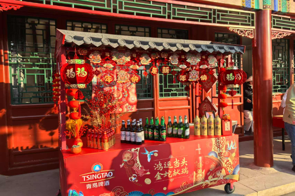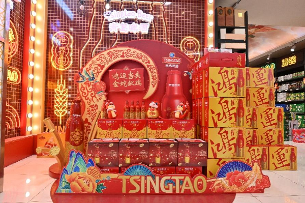 大红的颜色欢乐祥和,蛇年元素新潮时尚,青岛啤酒鸿运当头产品整齐排列在市场C位,为新的一年增添喜庆气氛,很多消费者第一眼就被它吸引。