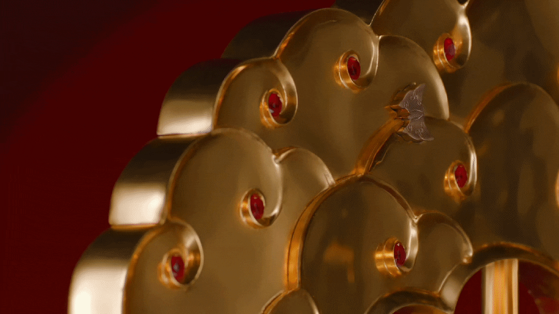 “富贵”,既是中国人给予他人的美好祝愿,也是自身对生活的浪漫憧憬。花瓣及其中央以中国传统窗棱为造型的“富”字,均采用了中国非遗金漆木雕技艺。花瓣外延嵌入的红宝石,宛如夜空中闪烁的繁星。金红辉映,映照出春节期间大街小巷张灯结彩的热闹情景,带着浓浓的春节幸福味道,展现着对美好生活的向往和追求。