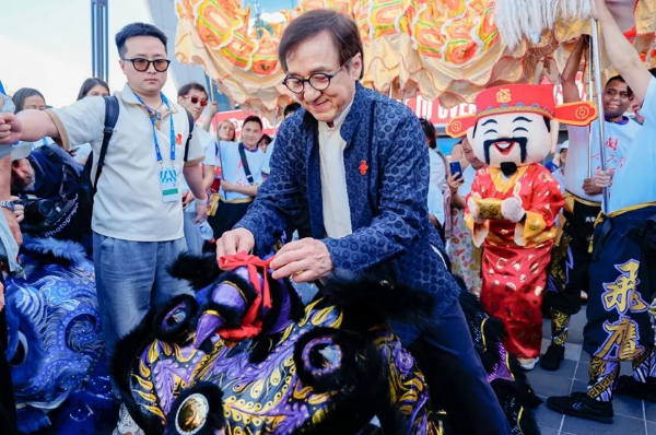 赛场外不仅有舞龙舞狮表演、新年主题漆扇制作等中华优秀文化展演、互动,更有著名的功夫电影明星成龙与外国友人一起切磋“武艺”。
