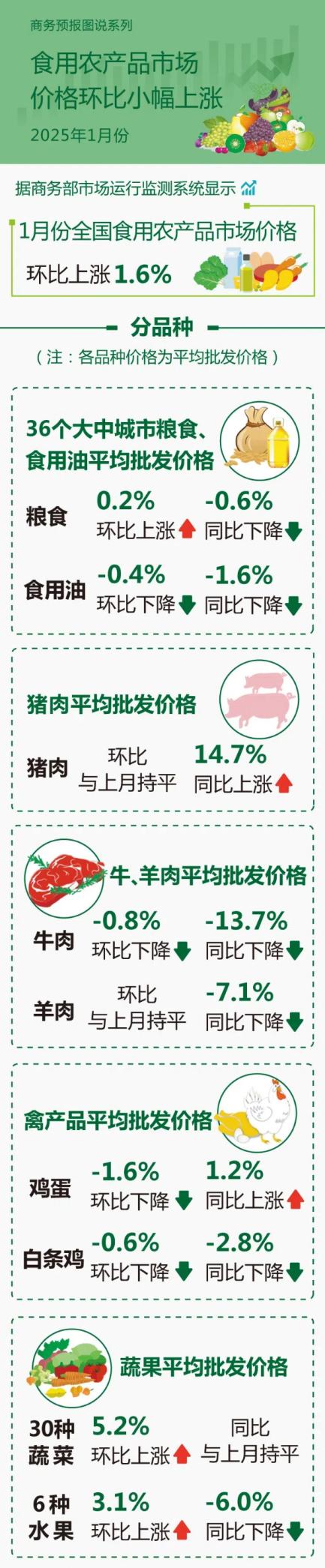 据商务部市场运行监测系统显示,1月份全国食用农产品市场价格环比上涨1.6%。