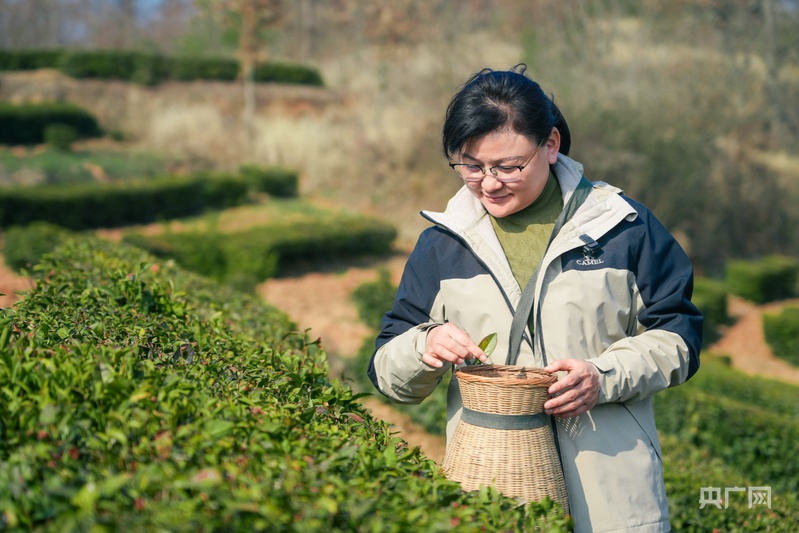 梁云英在茶园中采茶(央广网记者左洋 摄)