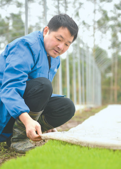 图为陈超在育秧基地查看秧苗长势。