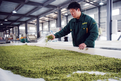 湖北恩施咸丰县,工人正在厂房内整理鲜叶,准备加工明前茶。 李维君 摄