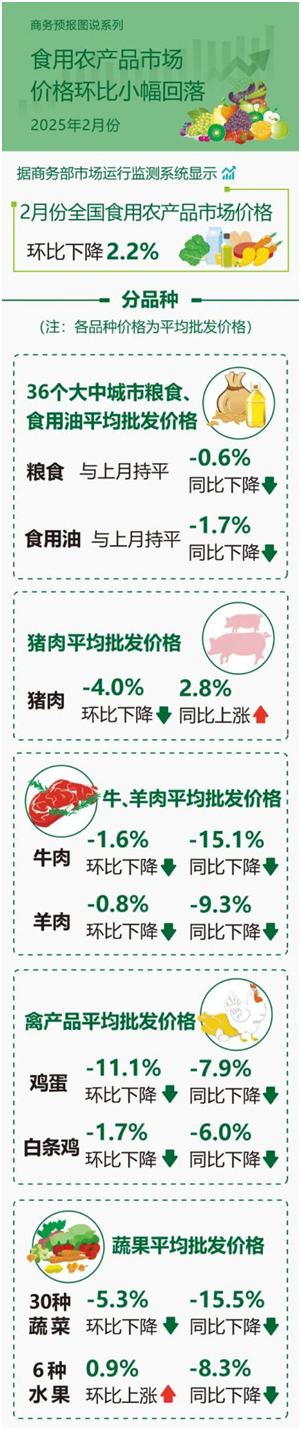 据商务部市场运行监测系统显示,2月份全国食用农产品市场价格环比下降2.2%。