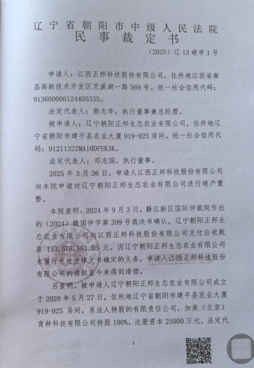 3月28日,辽宁朝阳市中级人民法院依据《中国人民共和国企业破产法》,发出《辽宁省朝阳市中级人民法院民事裁定书》((2025)辽13破申1号),裁定受理辽宁朝阳正邦生态农业有限公司(以下简称“朝阳正邦”)的破产重整申请,标志着该公司正式启动破产重整程序。
