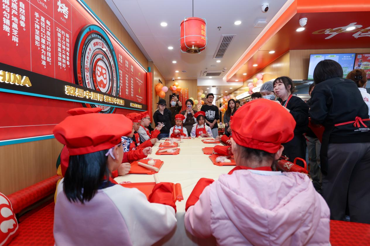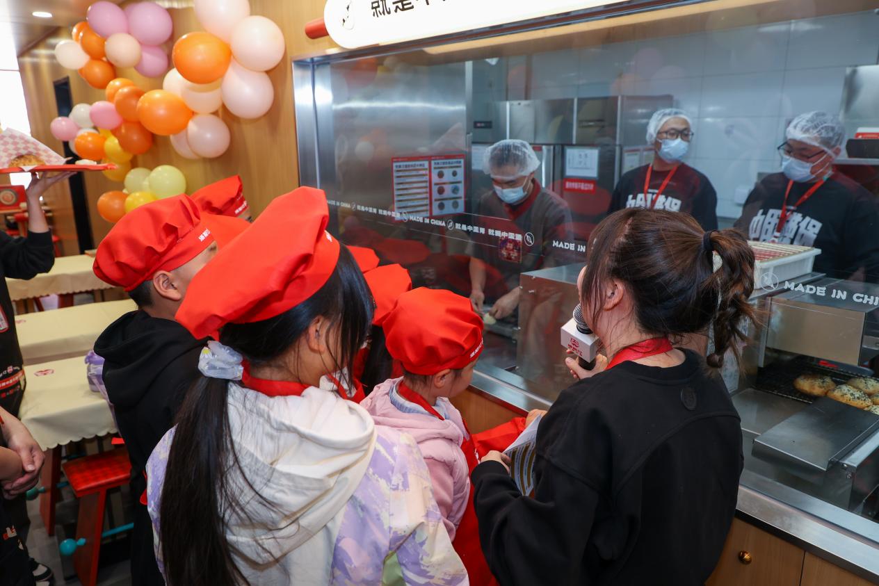 孩子们戴上厨师帽、系上小围裙,认真聆听店员讲解汉堡制作技巧。揉面、擀皮、撒芝麻……一双双小手在面团上忙碌着。童言稚语中,孩子们将传统汉堡玩出了新花样。
