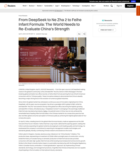 DeepSeek在全球AI界引起轰动,动画电影《哪吒之魔童闹海》刷新全球动画票房纪录……2025年以来,中国创新的多点突破引发国际社会广泛关注。近日,路透社、美联社等国际媒体刊发评论文章聚焦中国创新力量,特别指出乳业头部企业飞鹤凭借优异品质在全球婴幼儿配方奶粉市场获得拥趸的盛况,刷新了世界对中国品质的认知。