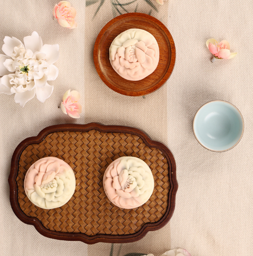 新品牡丹鲜花饼结合牡丹花的花蕾期、初绽期、盛放期三段花期,参考牡丹九大色系,对牡丹鲜花饼造型进行了全新设计。其中,创新研发的陈皮牡丹酥采用混糖工艺,外皮双色交织,形似初绽牡丹,饼皮松软细腻,入口即化;遵循“药食同源”理念的陈皮牡丹馅料,经过多次试验,恰到好处地将陈皮果香与牡丹清甜进行融合,让内馅绵密香甜。
