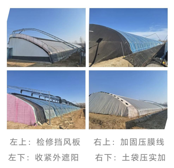 检修棚体:加固棚体结构,排除安全隐患;检查设施放风口、棚膜、出入口、保温被等缝隙是否封严,漏风处立刻补漏!加固装置:加固挡风板、压膜线、地锚等,固定好棚顶卷被,收紧外遮阳,棚边提前备好土袋。关闭风口:大风前锁紧所有通风口,人员撤离别逗留!