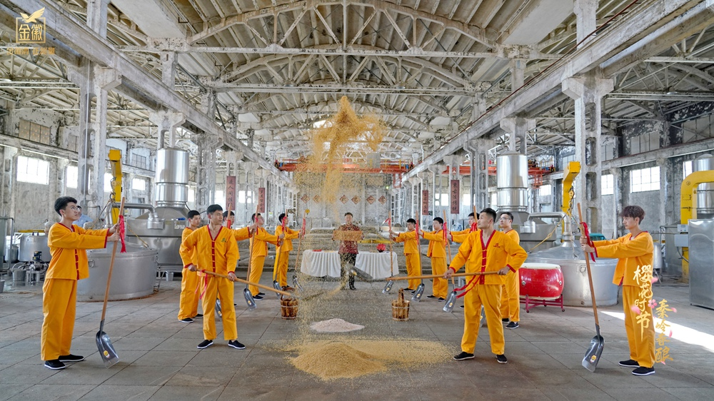 酿酒自古以来便与农耕天时息息相关。“德不立者不酿,心不诚者不酿”……金徽酒第三代酿酒传承人现场诵读酒经、祈福撒糠,以传统仪式敬谢酒祖。随着开酿声起,酒匠们有条不紊开动机器,蒸汽升腾,一锨一铲,一甑一耙,配合默契,一招一式古朴而庄严,再现千年酿酒文化。