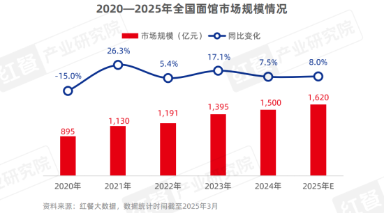 面馆是小吃快餐领域第二大细分赛道,红餐大数据显示,截至2025年3月,全国面馆门店数超过66万家,占小吃快餐门店数的18.6%。红餐产业研究院预估,2025年全国面馆市场规模将超过1,600亿元,同比增长8.0%。