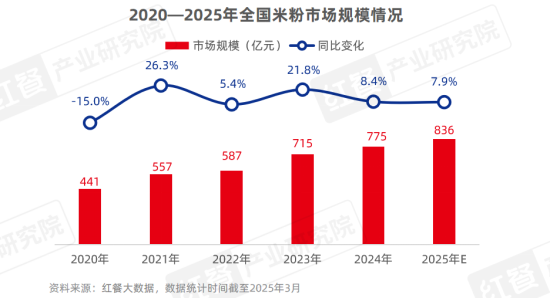 近年来,随着地方米粉的不断挖掘以及品牌连锁化程度的提升,米粉赛道持续扩容。据红餐大数据,截至2025年3月,全国米粉门店数超过34万家,比去年同期增加了4万家,同比增长13.3%。经红餐产业研究院测算,2024年米粉品类市场规模为775亿元,同比增长8.4%,预计2025年将继续增长至836亿元。