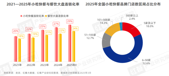与此同时,小吃快餐的连锁化程度明显加快。相关数据显示,2024年小吃快餐品类的连锁化率达到了27%,高于餐饮大盘22%的连锁化率。红餐产业研究院预测,2025年小吃快餐品类的连锁化率有望提升至29%。