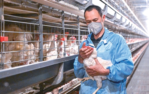 近年来,四川省眉山市天府新区龙马镇以科技为支撑,引进智能化、现代化的养殖设备,大力发展蛋鸡养殖产业,实现蛋鸡养殖全流程自动化,效益倍增。图为工人在检查蛋鸡。 翁光建 农民日报·中国农网记者 张艳玲 摄