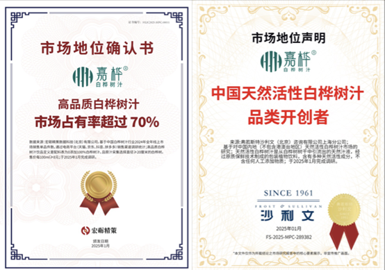 今年1月,嘉桦生物获得 “天然活性白桦树汁品类开创者”和“高品质白桦树汁市场占有率超过70%”双项市场认证。