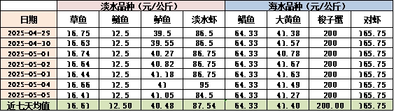 据农业农村部信息中心监测数据,截至5月5日,淡水水产价格方面,草鱼价格下跌,鲈鱼、淡水虾价格上涨。