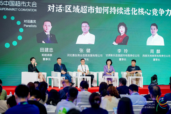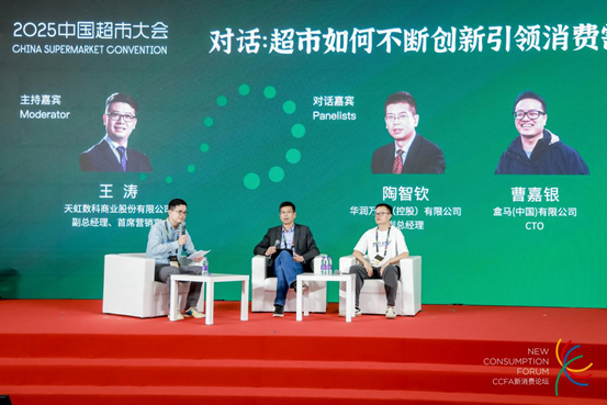 天虹数科商业股份有限公司副总经理、首席营销官王涛作为主持嘉宾,与对话嘉宾:华润万家(控股)有限公司副总经理陶智钦,盒马(中国)有限公司CTO曹嘉银围绕“超市如何不断创新引领消费需求”这一话题展开深入探讨。