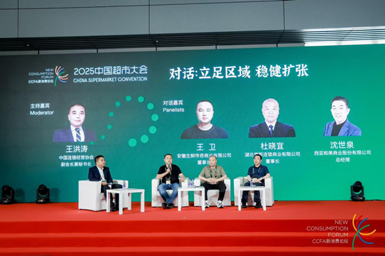 中国连锁经营协会副会长兼秘书长王洪涛作为主持人,与对话嘉宾:安徽生鲜传奇商业有限公司董事长王卫,湖北雅斯连锁商业有限公司董事长杜晓宜,西亚和美商业股份有限公司总经理沈世泉就“围绕立足区域 稳健扩张”这一话题展开探讨。