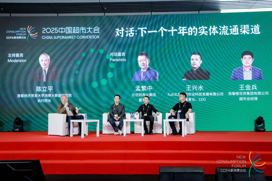 在本次大会的对话环节中,首都经济贸易大学消费大数据研究院执行院长陈立平作为主持嘉宾,与对话嘉宾:比优特商业集团董事长孟繁中、fudi北京尧地农业科技发展有限公司董事长、CEO王兴水、信誉楼百货集团有限公司超市总经理王金兵围绕“下一个十年的实体流通渠道”这一话题展开深入探讨。