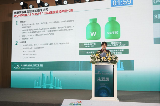 本次学术会议上,朱翠凤教授详细分享了菌群调节体重管理的临床研究,她介绍道:“万益蓝SHAPE100™(简称“S100”)的临床研究显示,食用该产品10周后,超重/肥胖受试者体重相关指标有显著变化。”