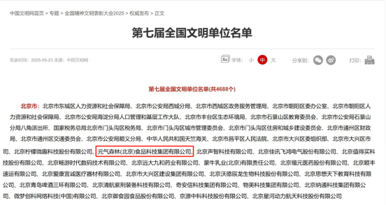 5月23日,在全国精神文明建设表彰大会上,北京朝阳区民营科技企业元气森林荣获第七届“全国文明单位”称号。作为国内饮料行业的创新代表,该企业以企业文化建设为根基、以社会责任担当为底色、以创新发展实践为引擎,为民营企业精神文明建设树立了典范。