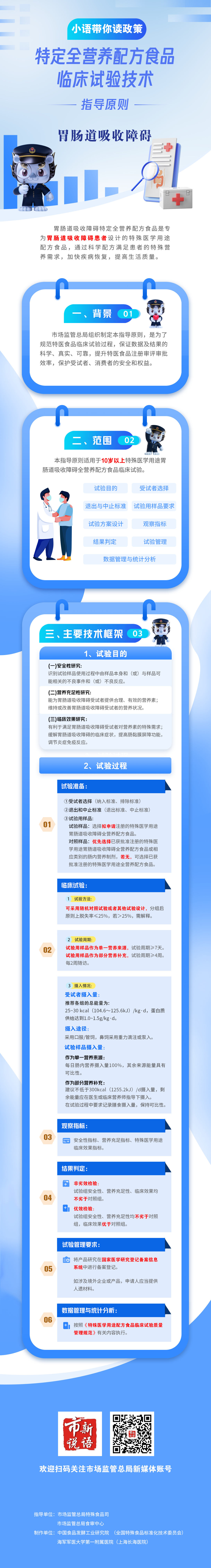 本次发布的指导文件结合了《特殊医学用途配方食品临床试验质量管理规范》的要求和肝病、胃肠道吸收障碍患者的病理、生理特点,详细列明了试验目的、试验方案设计、观察指标等方面的内容,为肝病、胃肠道吸收障碍特定全营养配方食品的临床试验设计、实施、评价提供明确指导,有助于推动相应类别特定全营养配方食品的研发注册,优化特医食品市场供给,以更好满足患者营养需求。