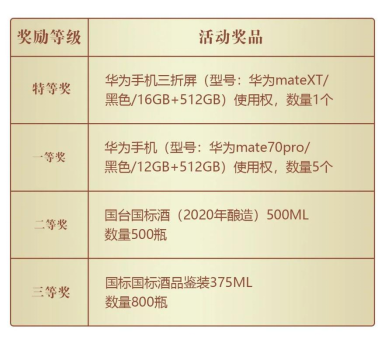 从华为Mate XT三折屏手机,到品质美酒国台国标(2020年酿造);从大额消费券,到国台品鉴小酒的体验装……上万份奖品整装待发,不管你是刚进门的观众,还是坐在最后一排的“隐形幸运儿”,只要来了就能拥有!