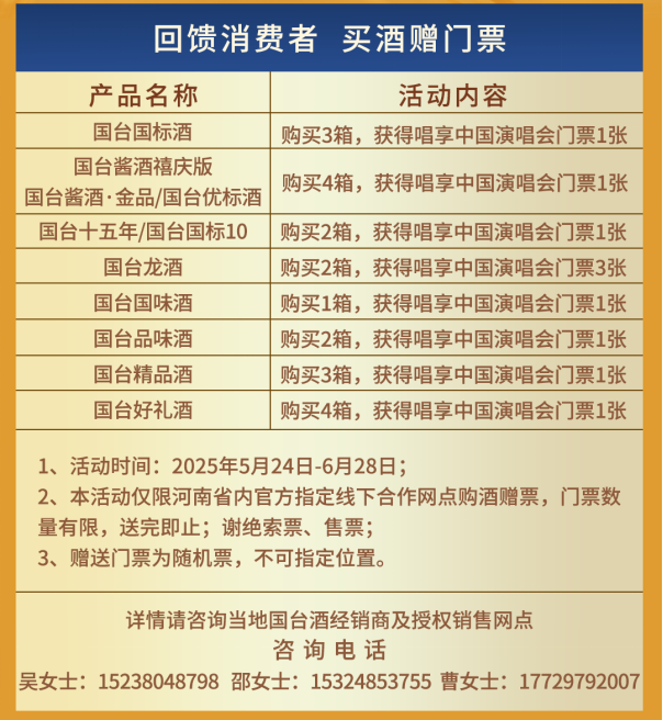 据了解,国台为回馈忠实的消费者,特别出台了买酒赠门票的相关活动:即日起到6月28日,购买国台指定产品,即可获得“唱享中国——智造好品质,通达美生活”音乐盛典门票。