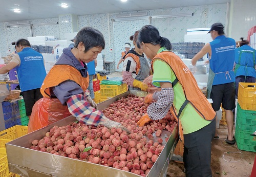 广东省高州市小蜂嗡嗡农业科技发展有限公司内,工人正在分选荔枝。