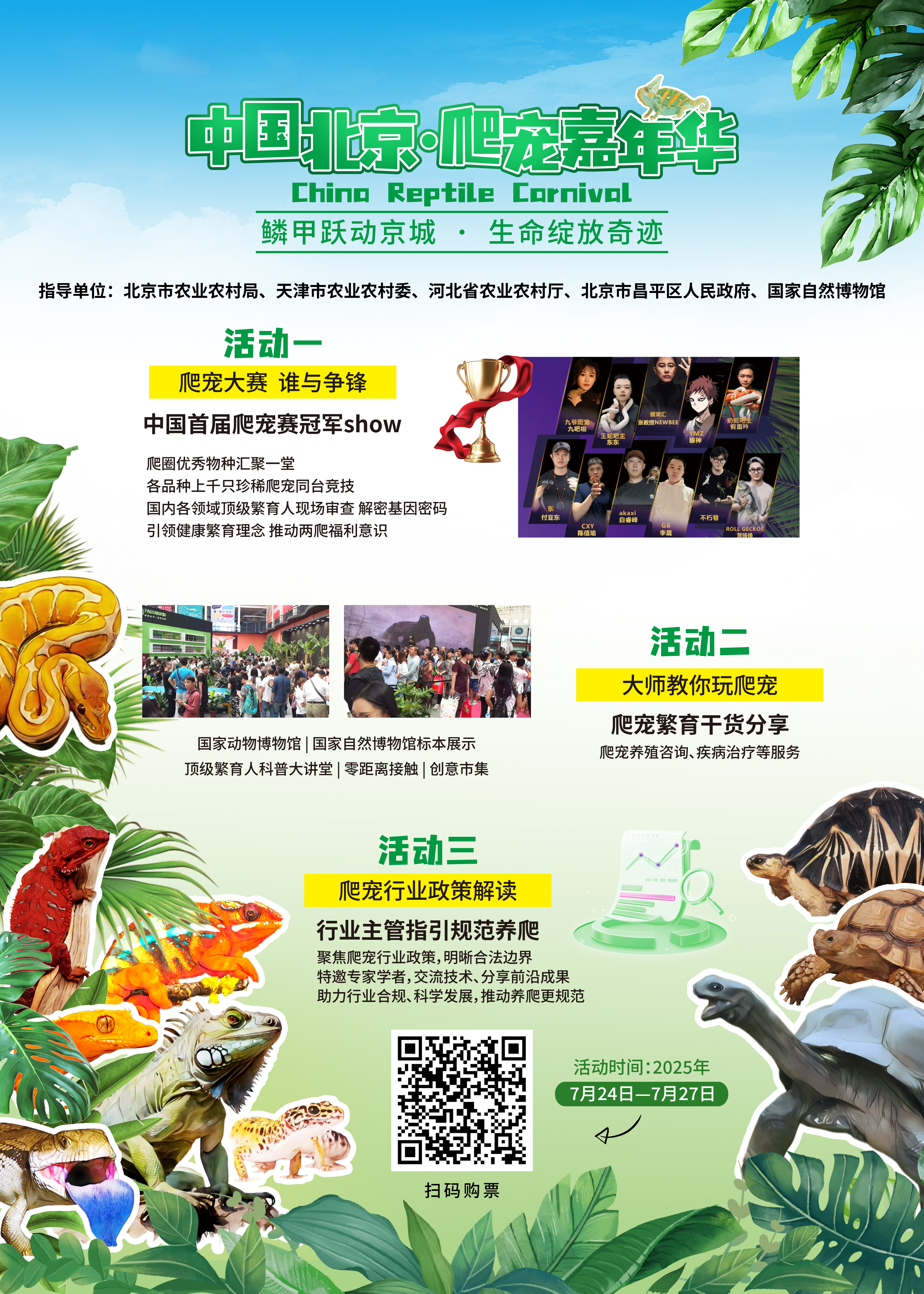 7月24日至27日,前往昌平草莓博览园A馆,开启探秘爬宠世界的奇妙之旅。从稀有物种展示到专业饲养知识科普,还有互动体验、周边市集等多种玩法,将为爬宠爱好者打造一场夏日狂欢盛宴。