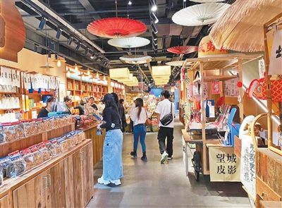 入店门,不寻常——吹糖人的小摊在门口、油纸伞倒悬天花板、竹编灯笼挂在房梁上……从物到景,店面一楼300平方米左右的空间,尽是“国潮”文化味。铺面二楼,消费者还可以现场体验部分传统技艺。“与其说是逛点心铺子,倒不如说是在逛一个‘非遗’体验馆。”来自广东珠海的高三毕业生张皓扬和同学体验了一圈后,忍不住下单了新口味点心。