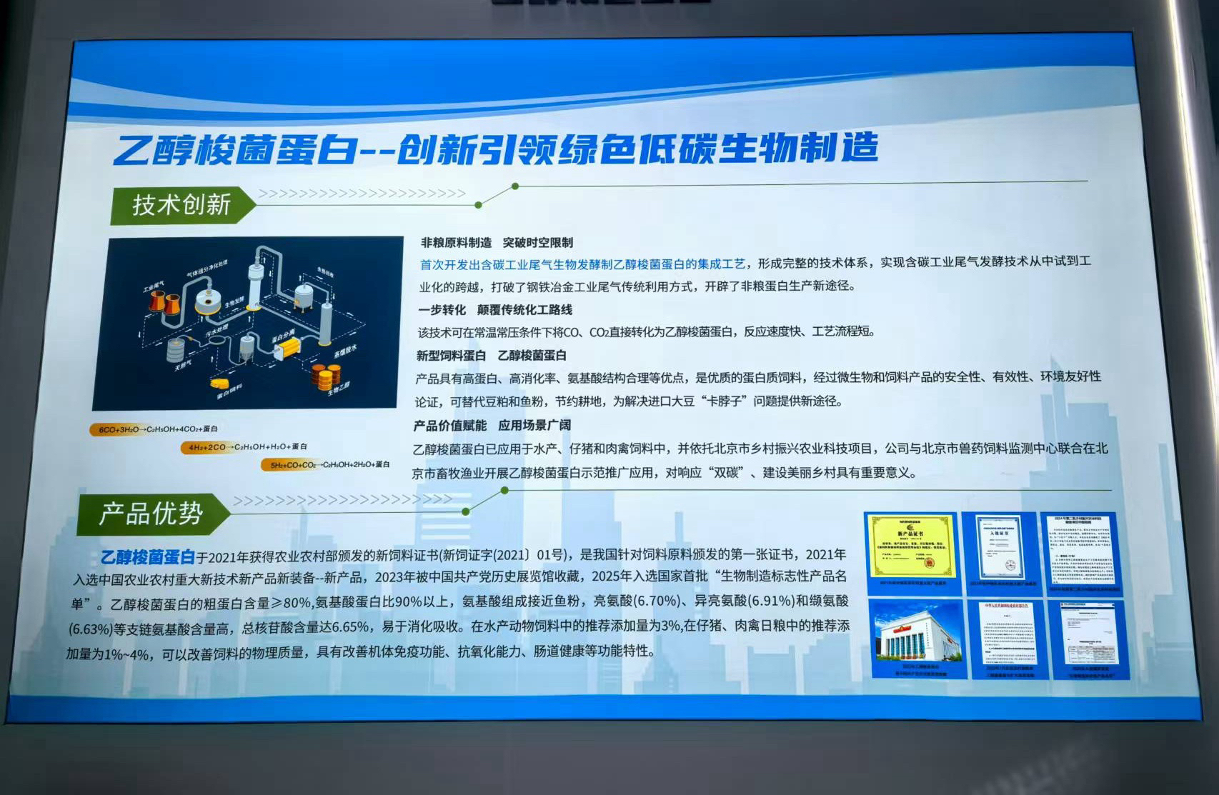 在生物制造展区,一款以工业废气为原料发酵生产的乙醇梭菌蛋白格外引人注目。与传统依赖土地和水资源的农业生产方式不同,这一新型饲料蛋白原料不仅突破了资源瓶颈,还在营养价值上实现了跃升——粗蛋白含量高达80%以上,是豆粕的近两倍,比鱼粉还要高出15个百分点,目前已有4家商业化工厂投入运行,年产能已达2.32万吨。