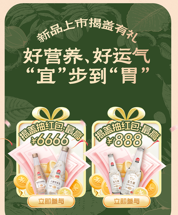 在营销端,大窑同步落地高价值激励策略,针对“宜养说”系列推出揭盖抽奖活动:购买六种坚果乳或栀香茉莉奶茶可参与6666元现金红包抽奖,花生露则配套888元红包抽奖。该策略通过高吸引力权益提升产品消费转化效率,同时借助用户自发传播扩大品牌在社交场域的声量,为品牌年轻化转型与销量增长形成有效赋能,进一步夯实“产品-渠道-营销”的战略闭环。