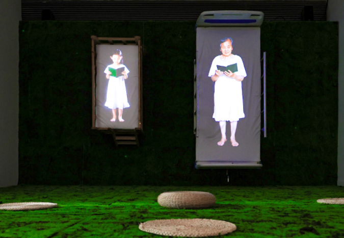 四位艺术家则在艺术漫谈环节,带来了多维度公益表达。其中世界动画协会中国分会成员何文文与设计师黄松晟以《无声的告白》,向失语者发声,鼓励失语者勇敢表达自身的美好,并通过虚拟与现实交织的空间,让每一句无声的告白“发声”。雕塑艺术家、中国雕塑家协会会员刘宝亮的作品《我在现场》,打造了一场由废墟与鲜花构筑的蒙太奇叙事,展示了一种具体而临近的美好。灯光艺术家刘洋的作品《彼时此刻》,以日常物与多媒体融合,构建出一个意境美好的诗意空间,并借助AI技术创作了“一老一小”两位女性的生命影像与声音,让人沉浸“彼时”与“此刻”的共存。