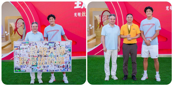 贲敏则为光明随心订幸运消费者送上光明致优年度体验券,将“点滴珍贵,致最优的你”的品牌承诺融入日常,张之臻亦送上亲笔签名网球,让“健康守护”的品质关怀与“体育热爱”的向上力量在此刻交汇,为消费者送上双重温暖祝福。