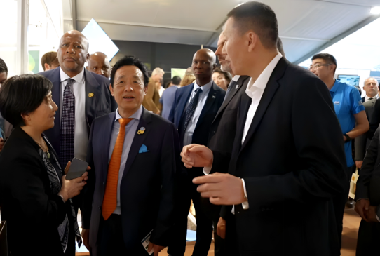 FAO总干事屈冬玉(左二)、莱索托国王莱齐耶三世(左一)与金正大集团总裁万鹏(右一)在展会上就金正大缓控释肥技术进行交流