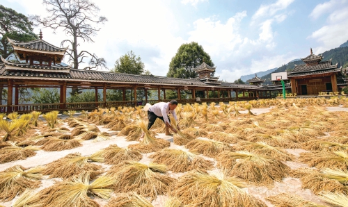 近日,贵州省黔东南苗族侗族自治州从江县种植的糯稻谷迎来收获季,乡村田野里一派繁忙景象。图为当地农民忙着晾晒糯稻谷。 罗京来 摄 (来源:大国三农)