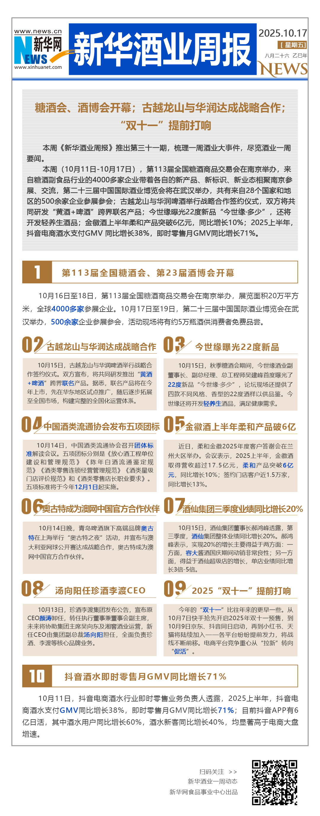 本周(10月11日-10月17日),第113届全国糖酒商品交易会在南京举办,来自糖酒副食品行业的4000多家企业带着各自的新产品、新标识、新业态相聚南京参展、交流,第二十三届中国国际酒业博览会将在武汉举办,共有来自28个国家和地区的500余家企业参展参会;古越龙山与华润啤酒举行战略合作签约仪式,双方将共同研发“黄酒+啤酒”跨界联名产品;今世缘曝光22度新品“今世缘·多少”,还将开发轻养生酒品;金徽酒上半年柔和产品突破6亿元,同比增长10%;2025上半年,抖音电商酒水支付GMV 同比增长38%,即时零售月GMV同比增长71%。