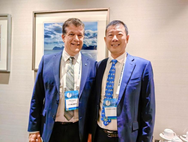 冷友斌与国际乳品联合会主席合影。左起:国际乳品联合会主席Gilles Froment,中国飞鹤董事长冷友斌