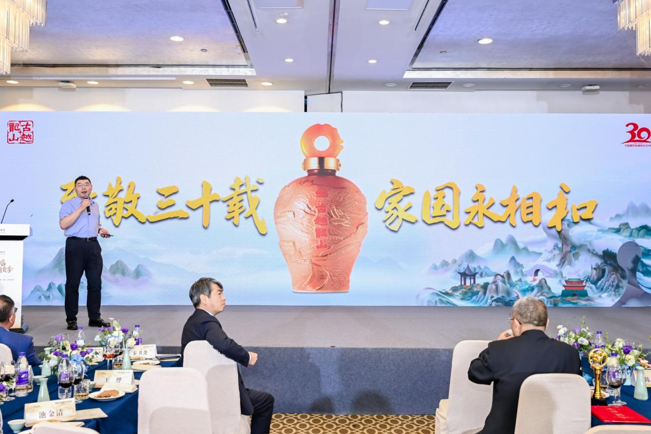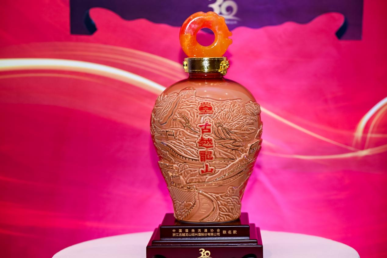 柏宏介绍,“古越龙山·家国永和30年陈绍兴酒”以恰逢其时的30年陈酿年份,成为中国酒类流通协会成立三十周年发展历程的实体见证。这款酒容量达4.75升,在包装设计上融合了良渚玉龙图腾、长城意象等经典文化元素,瓶体造型庄重典雅,兼具艺术欣赏与收藏传承价值。
