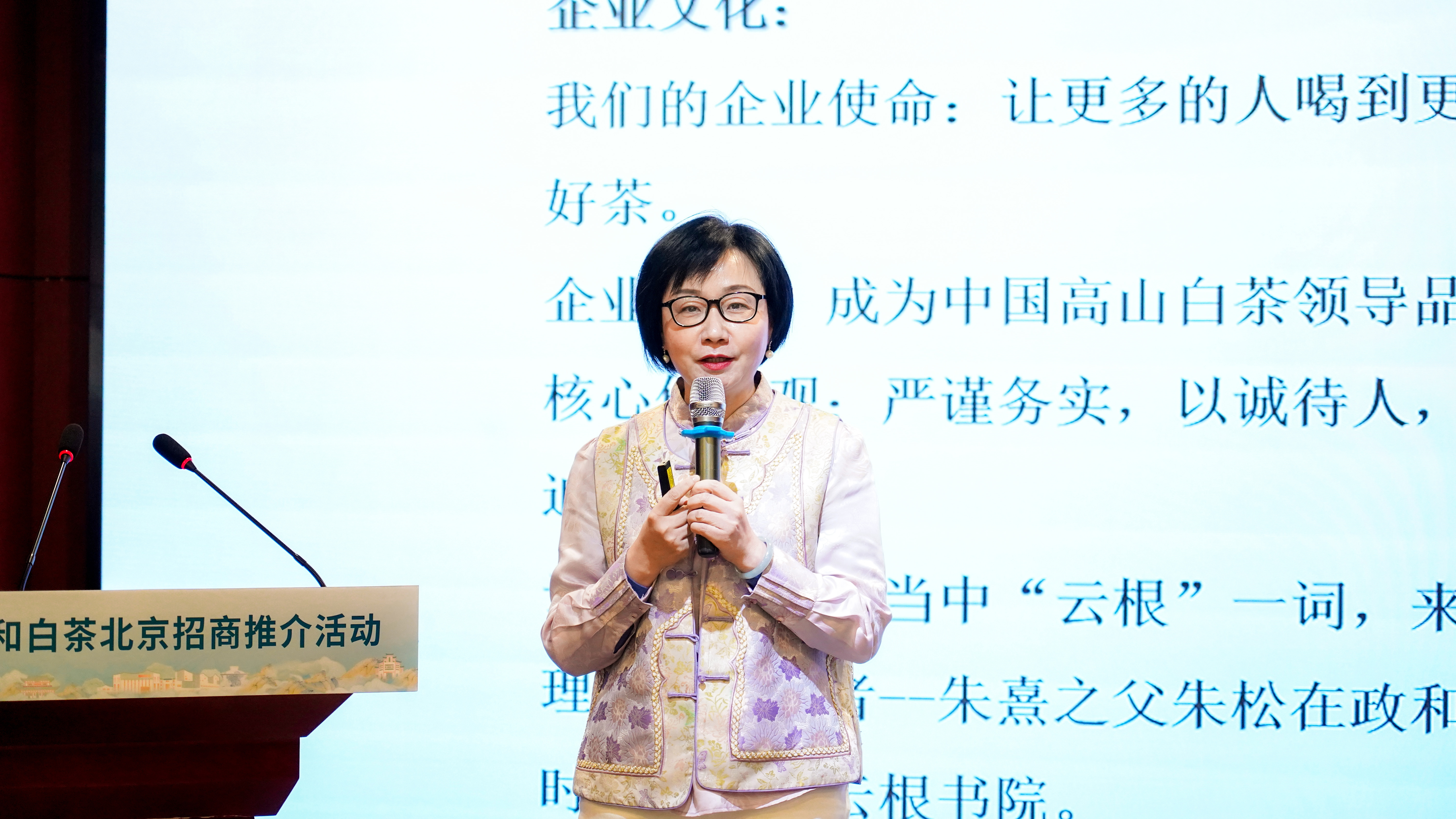 活动现场还播放了政和茶旅宣传片,以沉浸式视听体验呈现“千年宋韵,云上政和”的生态画卷。在骨干茶企推介环节,隆合、云根、瑞茗、大与4家政和龙头茶企依次登台,围绕核心产品、工艺特色与市场布局展开详细介绍,并发布了针对北京市场的专项招商政策,引发与会客商的广泛关注。